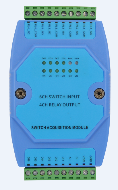 SST-S8064為6路數(shù)字量輸入(DI)和4路數(shù)字量輸出(DO)采集設(shè)備,DO可以輸出常開(NO)、常閉(NC)兩種狀態(tài)。采用標(biāo)準(zhǔn)的Modbus RTU通訊協(xié)議,可以通過RS485總線進(jìn)行遠(yuǎn)程DI數(shù)據(jù)采集傳輸。
